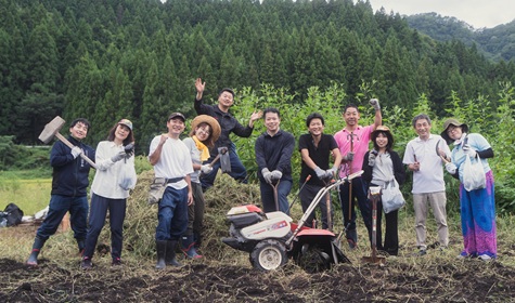 佐々木さん夫妻(写真左から3,4人目)が地域の人から譲り受けた耕作放棄地を耕し、畑として活用するための開墾作業を行いました。佐々木さんが西会津町に移住して地域の人々とコミュニケーションをとりながら地域活性に取組む姿から、心が通った人間関係や対話の温かみを感じました。