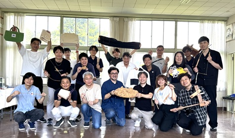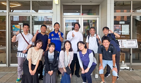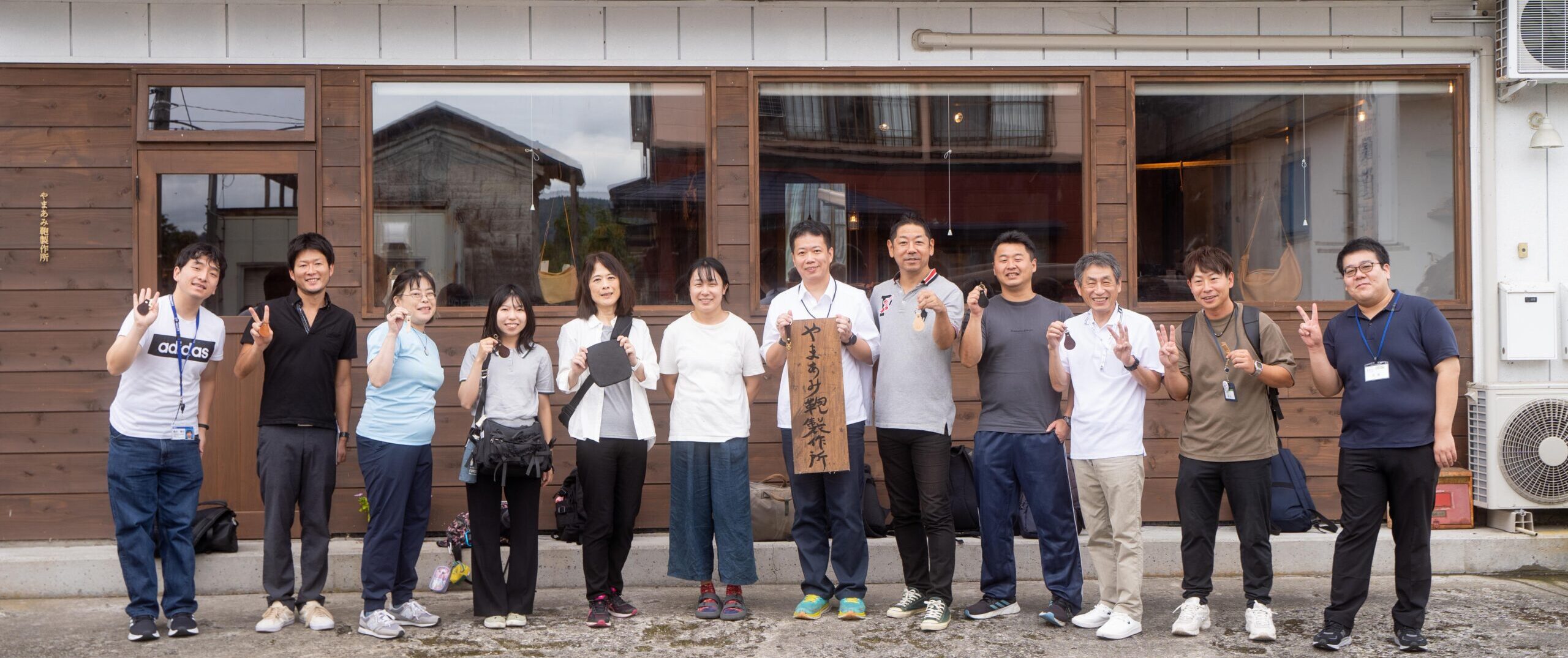 震災後に綿花の栽培から加工まで一貫体制を築き、近年は廃校を地域資源として再生してきた株式会社起点代表 酒井さん(写真一列目中央)。参加者はその挑戦に触れ、地域の価値とものづくりに込められた想いを実感していました。