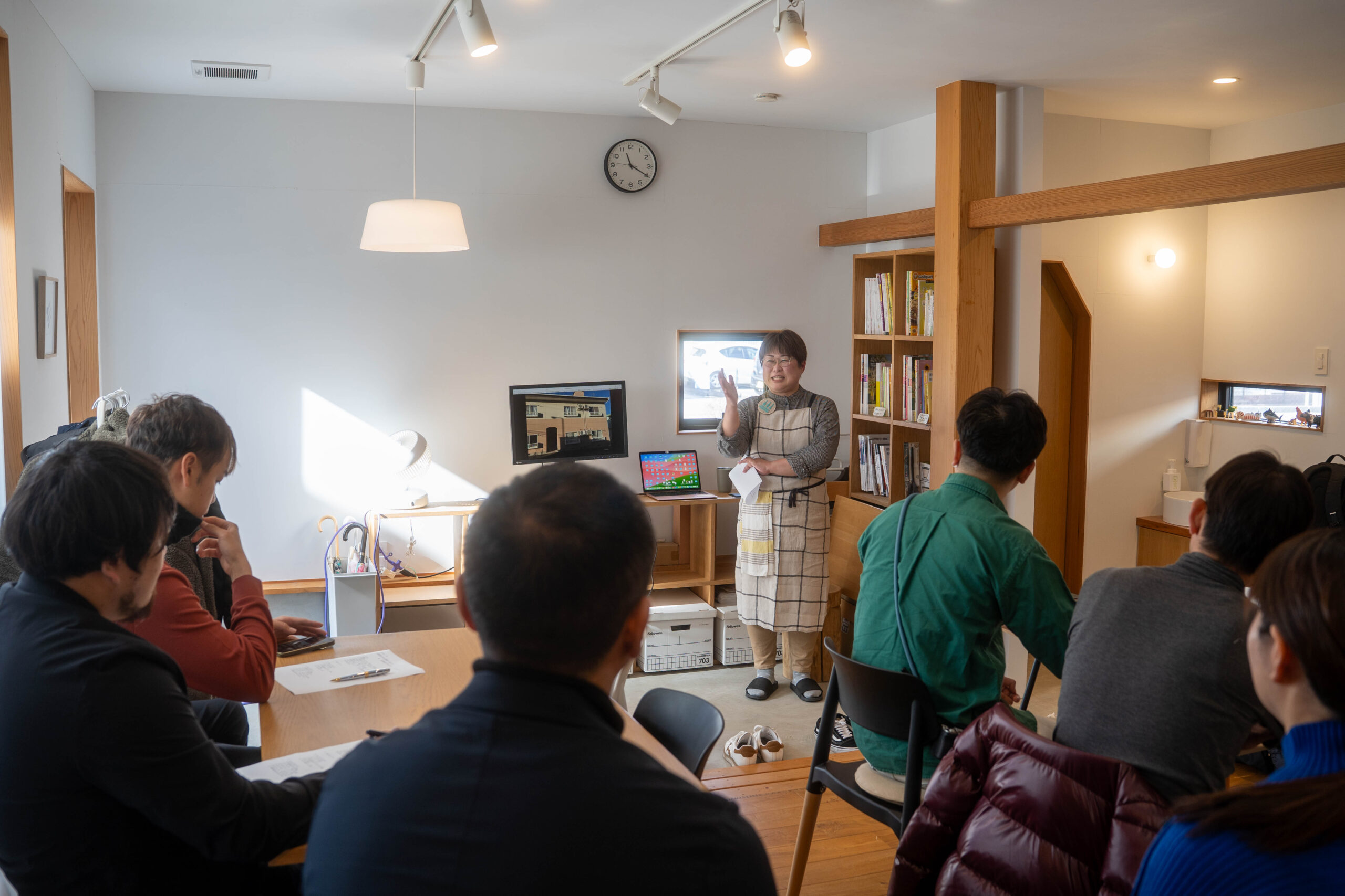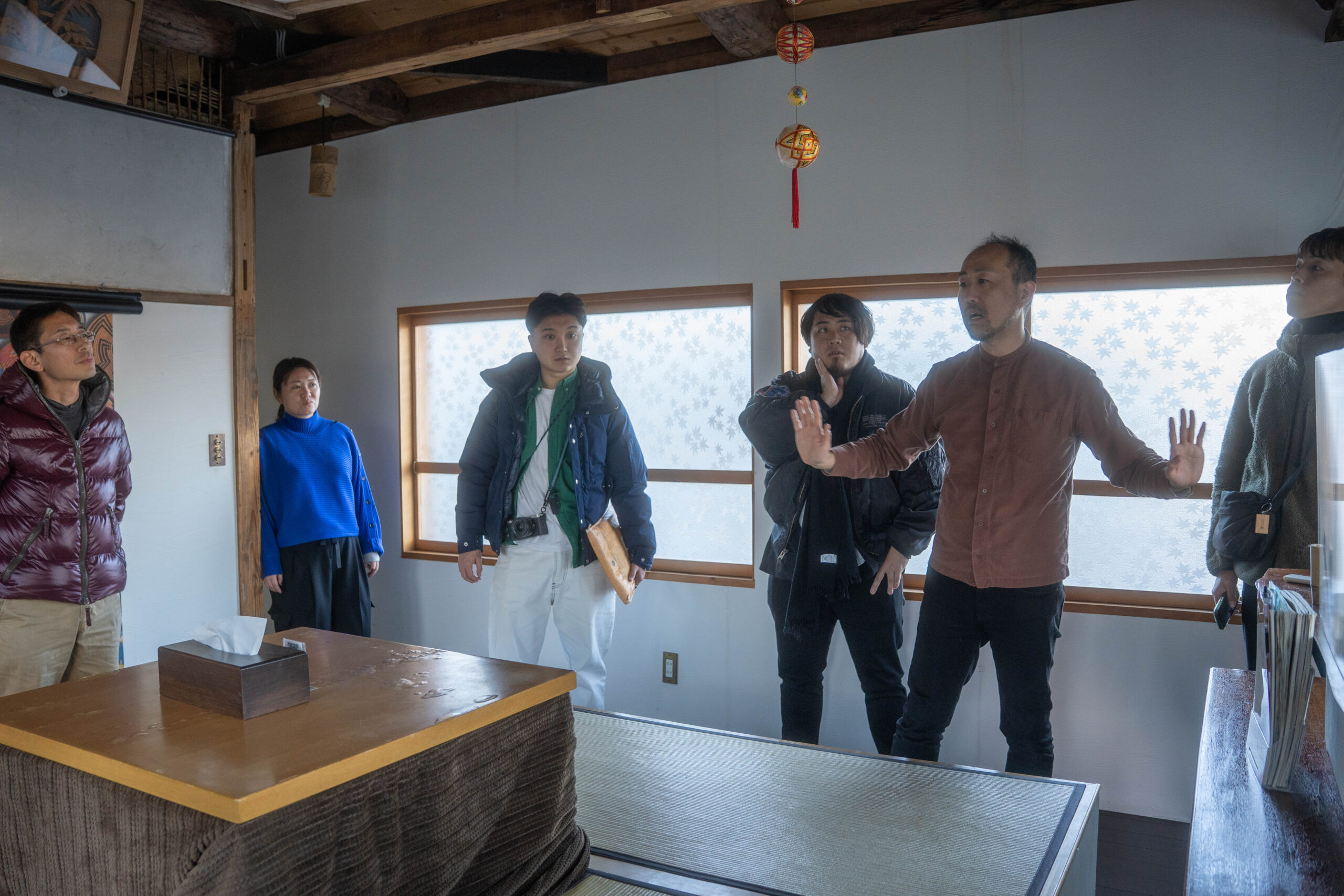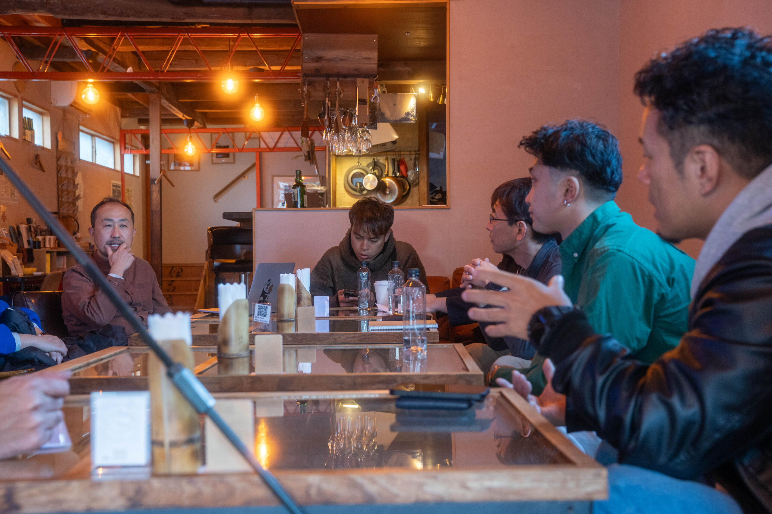 ・Guesthouse & Kitchen Hace 空き家を活用したゲストハウスやプライベートサウナを経営する三上健士さん(写真左から4番目)、地域活性のプロデュースを手掛ける熊田誠さん(写真左)と、地域デザインやコンテンンツづくりについての意見交換